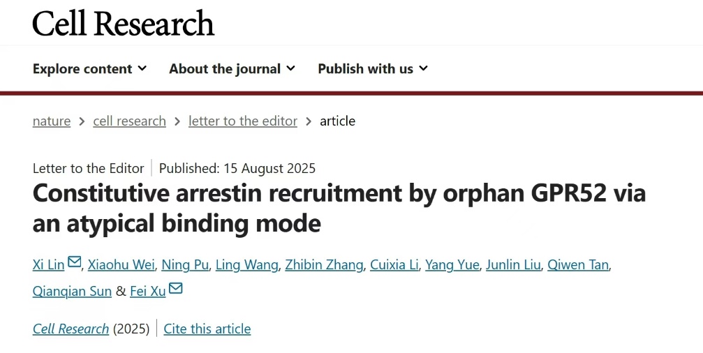近日,上海科技大学iHuman研究所徐菲课题组在《细胞研究》(Cell Research)上发表题为“Constitutive arrestin recruitment by orphan GPR52 via an atypical binding mode”的研究成果,解析了孤儿受体GPR52与下游信号转导蛋白β-arrestin1的复合物结构并揭示了一种独特的结合模式。该工作不仅深化了对GPR52组成性活性的分子机制理解,也为系统认知孤儿受体的信号转导网络提供了关键结构基础。