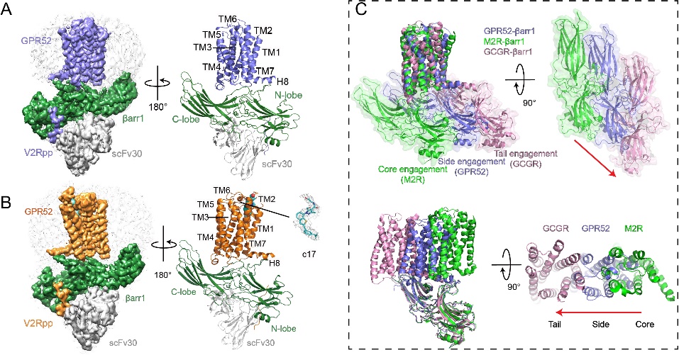 图1:(A和B)无配体(A)或c17(B)结合的GPR52-arrestin复合物的结构。(C)GPR52通过一种非典型组装模式结合β-arrestin1。