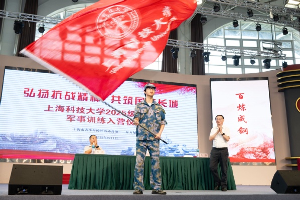 吴强为参加本次军训的本科生授校旗。2025级本科生代表赵智博接过校旗向全场展示。一抹属于上科大的火红,在台上舒展、飘扬,化作军训路上最鲜明的指引。