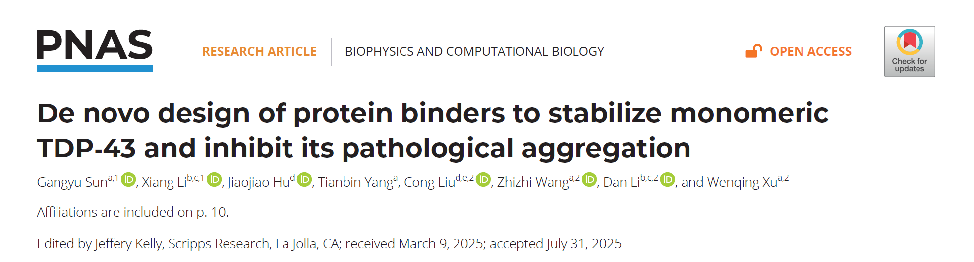 近日,上海科技大学生命科学与技术学院许文青课题组和合作者在国际学术期刊《美国科学院院报》(PNAS) 发表了题为“De novo design of protein binders to stabilize monomeric TDP-43 and inhibit its pathological aggregation”的研究论文,首次通过人工智能驱动的从头蛋白质设计技术,开发出可高亲和力特异性结合TDP-43 LCD聚集核心的新型结合剂,在体外和细胞模型中均实现了对TDP-43病理性聚集的高效抑制,为神经退行性疾病的靶向治疗提供了全新策略。