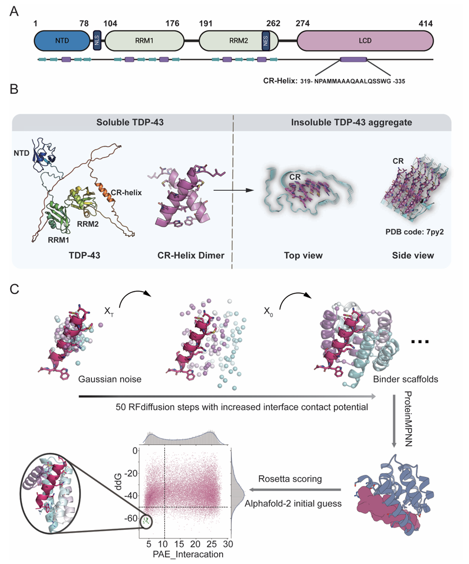 TDP-43的生理功能依赖其结构化的N端结构域(NTD)和RNA识别基序(RRM1/2),而C端LCD是病理性聚集的主要驱动因子。LCD中,319-335残基在生理状态下呈α螺旋构象,而疾病状态下会发生“α螺旋→β折叠”的构象转变,进而组装成多形态纤维聚集体。本研究以“稳定TDP-43 CR区域α螺旋构象”为核心目标,搭建了从计算设计到功能验证的完整研究流程。借助扩散模型生成候选支架,经深度学习工具优化序列以增强与CR区域关键位点的相互作用,再通过能量筛选与结构预测,最终确定高潜力结合剂候选(图一)。