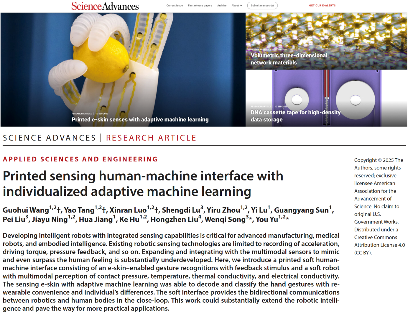 9月10日,上海科技大学生物医学工程学院于游课题组和合作者在《科学进展》(Science Advances)上发表标题为“Printed sensing human-machine interface with individualized adaptive machine learning”的研究论文,报道了一种3D打印技术制备的多模态传感柔性生物电子,结合个体间自适应的机器学习算法,打通了从控制、手势识别到机器人触觉感知反馈的交互路径,并且进一步在智能假肢方面展现出巨大的应用潜力。