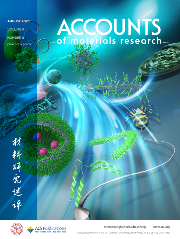 62025年第八期封面文章From Peptides to Silk-Inspired Proteins: Self-Assembling Systems for Functional Biomaterials (Simon Sau Yin Law*, Ali D. Malay, and Keiji Numata*. Acc. Mater. Res. 2025, 6, 8, 964–978. https://pubs.acs.org/doi/10.1021/accountsmr.5c00087) 来自日本京都大学Keiji Numata教授团队,介绍了课题组开发的功能性肽和丝蛋白及其组装体,阐明了大型纤维结构蛋白质的自组装机制,以及如何面向不同的应用调节它们的特性。