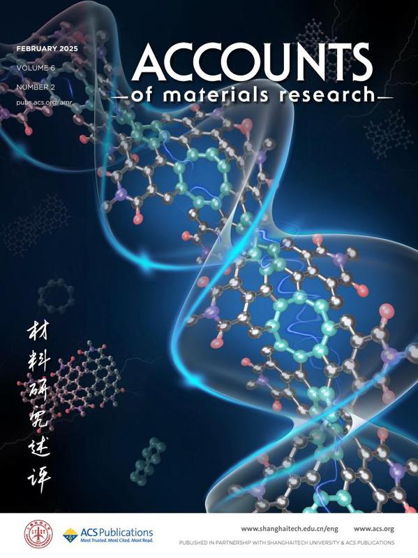 32025年第二期副封面文章 Chiral Molecular Carbon Imides: Shining Light on Chiral Optoelectronics (Yihan Zhang, Yujian Liu, Wei Jiang*, and Zhaohui Wang*. Acc. Mater. Res. 2025, 6, 2, 158–171. https://doi.org/10.1021/accountsmr.4c00304) 来自清华大学王朝晖教授-姜玮副研究员团队,全面概述了三类代表性的手性分子碳酰亚胺 (CMCIs):单链、双链和多链手性共轭螺旋的理性设计策略、基本的手性光学特性和手性光电应用。文章重点介绍了增强手性光学相应的策略,深入探讨了手性结构与激发态参数之间的内在关联。最后,文章介绍了此类材料在多功能自旋极化光电器件中的广阔前景。