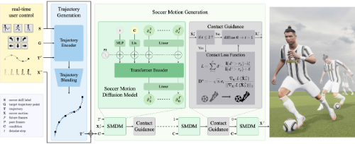 针对足球运动场景中复杂的运动轨迹与高度动态的人物交互,研究团队提出了一种基于Diffusion 模型的两阶段实时足球动作生成框架 SMGDiff,该框架包括一个轨迹生成模块和一个动作生成模型:轨迹生成模块采用 one-step diffusion 策略高效生成多样化的人物运动轨迹;动作生成模型引入接触引导机制,并提出 Contact loss 以在 Diffusion 采样过程中优化球与脚之间的动态接触关系。本研究为实时、高动态的人物交互动作生成提供了新的技术思路。