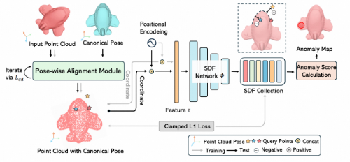 在高端装备智能质检领域,传统离散点云表达方法存在的几何细节丢失、异常定位不精确瓶颈,研究团队创新性地提出了PASDF方法。该研究采用连续、高精度的有符号距离场,并结合姿态自适应的对齐模块,能够实现对物体三维异常的精准定位和高质量自动修复。该方法在国际权威数据集Real3D-AD和Anomaly-ShapeNet上分别取得了80.2%和90.0%的检测准确率(O-AUROC),并大幅提升了异常区域的修复效果。