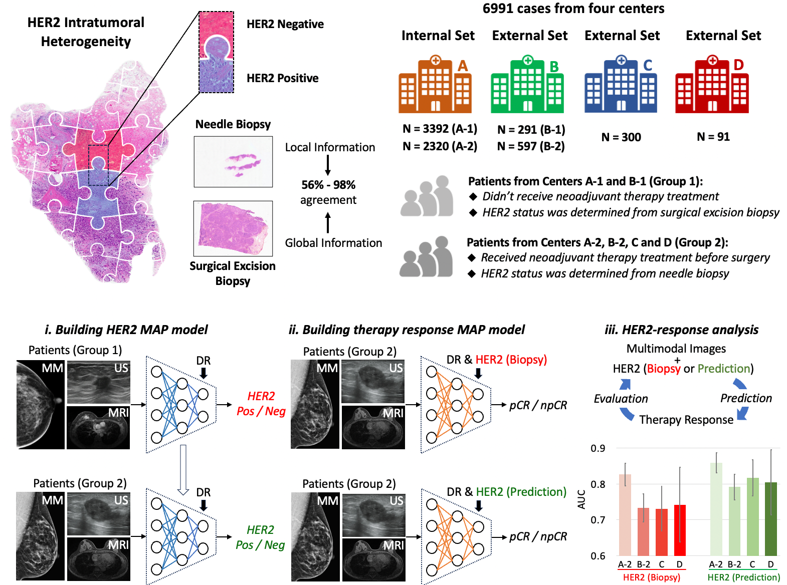为解决这一难题,研究人员开发了一种基于深度学习的新型非侵入式方法——多模态对齐与预测模型(MAP)。MAP利用多模态影像(如乳腺钼靶、超声、磁共振),无需穿刺即可预测HER2状态。研究依托来自4个中心、6991例患者的大规模数据集进行训练与验证。结果显示,MAP的预测结果与术后病理一致性更高,且基于其预测的HER2状态所推断的新辅助治疗响应准确率,显著高于基于穿刺活检结果的预测。