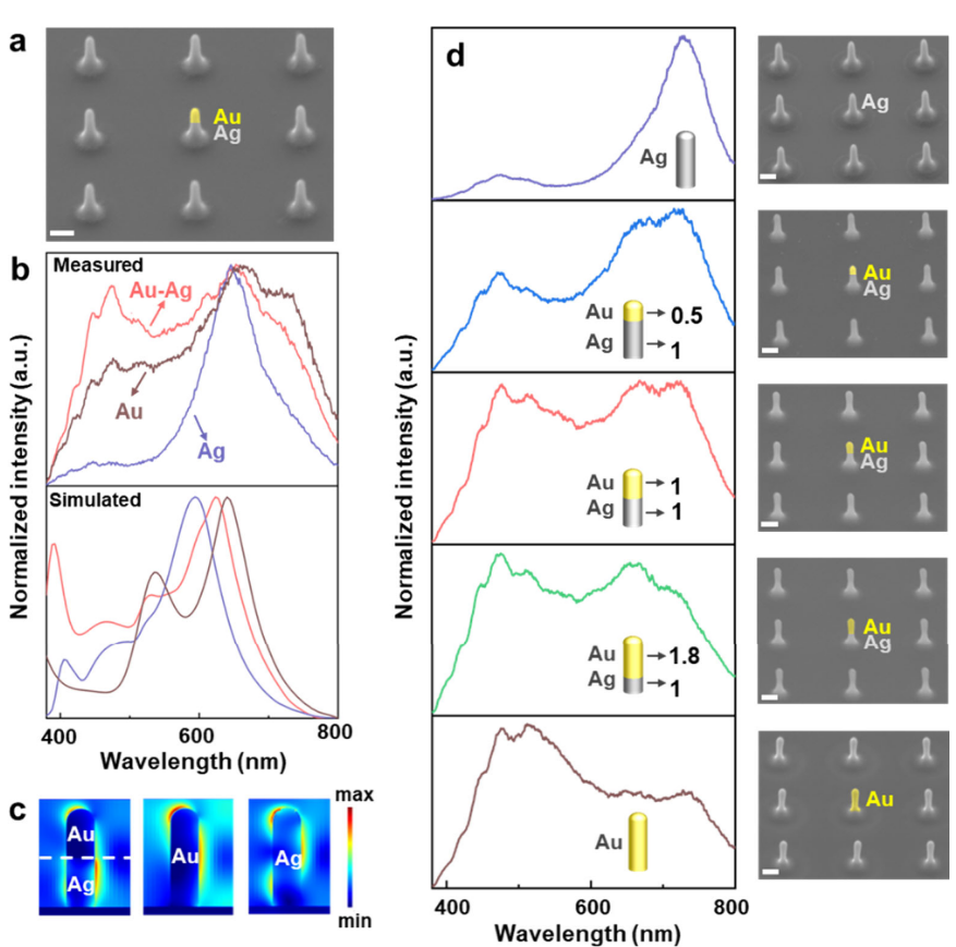研究团队通过精确控制纳米天线的身高参数和材料组合(纯金、纯银或金-银叠层,图2–图4),实现了对特定颜色光波的精准响应。就像收音机通过调节频率来接收不同电台一样,这些纳米天线可以通过结构和材料的调整来捕捉可见光。实验显示,金-银叠层结构的天线更能同时发挥两种材料的优势,实现对更宽波段范围的响应。