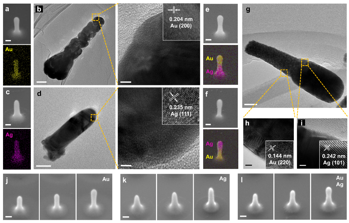 图1:Au、Ag及其叠层纳米天线阵列。第一行和第二行SEM的Scale bar分别为1000和200 nm)