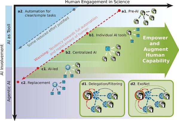 美国布鲁克海文国家实验室Esther Tsai博士和Kevin Yager博士团队总结了人工智能在科学领域的进展方向:一是通过自动化和智能工具提高效率,从而加速人类已在执行的任务进展;二是赋能对未知领域的探索,并可能迈向通用人工智能(AGI)。为了探讨人类在这一不断演变格局中的作用,作者提出第三个展望:开发形成以人为中心网络的个性化智能体,既支持效率提升又支持探索,同时确保人工智能与人类愿景保持一致。