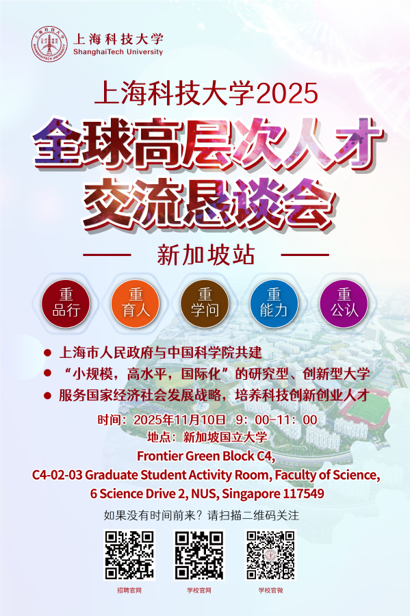 上海科技大学将于11月10日上午在新加坡举办高层次人才交流恳谈会,学校人才工作负责领导及相关学科领域教授将现场介绍学校情况及人才政策等,并与现场参会学者进行答疑互动与深度交流。