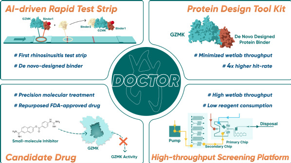 在诊断方面,团队设计了新型胶体金试纸,可实现鼻窦炎的早期、快速检测。团队借助AI技术设计小型结合蛋白,首次实现传统抗体的替代,降低了试纸开发的时间与成本。在治疗方面,团队通过高通量筛选获得了具有良好性质的小分子药物前体,实现了“老药新用”,为鼻窦炎的靶向治疗提供了新的思路与可能。