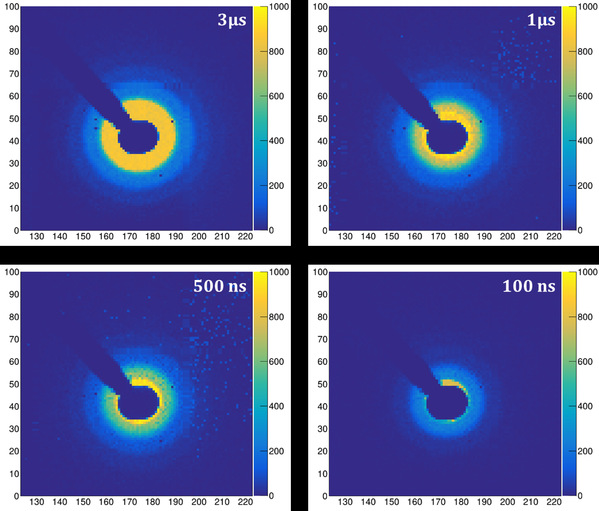 SDB是HEPS的特色线站之一,主要聚焦于增材制造、动态加载等不可逆过程的超快时间分辨原位、实时动态表征。其中,小角散射时间分辨率是该线站的关键指标之一,设计指标为2μs。10月13日,在线站常规探测器信噪比受限、无法获取高质量小角散射信号的情况下,应线站邀请,“星光”探测器团队协助开展了小角散射时间分辨率指标的现场测试,并顺利获取了最短单帧100ns曝光的小角散射信号。该测试结果优于线站设计指标20倍,保障了线站全指标工艺测试的顺利通过。