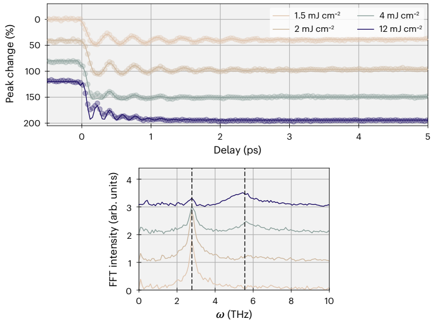 不同于对体相敏感的轨道布拉格峰的超快演化,表面轨道序熔化的同时伴随明显的声子耦合震荡,而且在高强度泵浦情况下出现震荡频率倍频。由于体相敏感的轨道布拉格峰的超快演化受到非本质的异质性影响,表面敏感的测量才是更真实的超快激光驱动的相变过程。当然,这个过程不可避免地受到表面的特殊性影响。另外,在表面轨道序熔化的同时,出现了大范围的漫散射信号。小动量长程的声子首先大量被激发,然后过渡到短程和局域轨道涨落强耦合的晶格畸变极化子。这样的过程揭示:La0.5Sr1.5MnO4中光诱导轨道序熔化相变由非相干的无序增长主导。