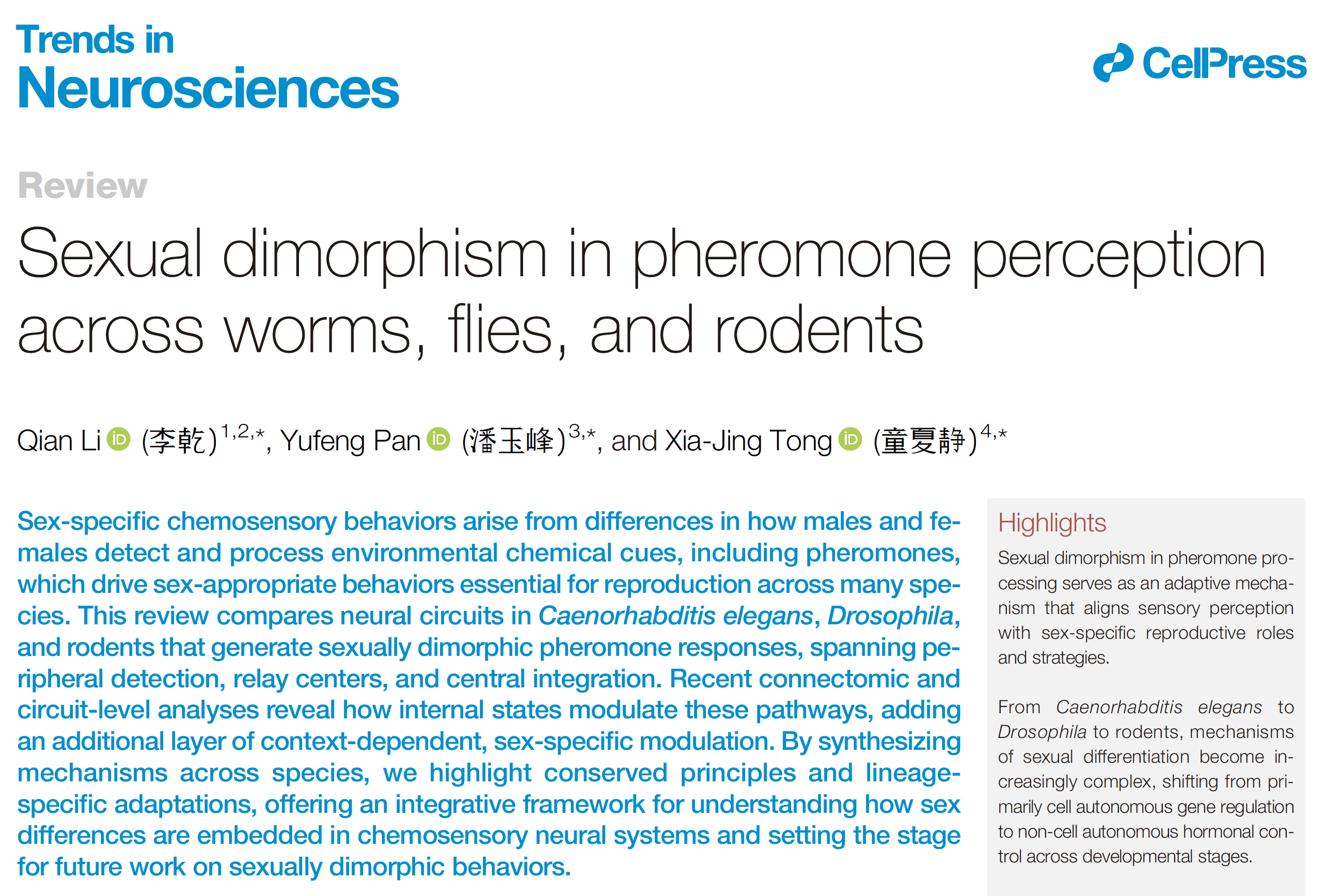 近日,上海科技大学生命科学与技术学院童夏静课题组与上海交通大学医学院李乾课题、东南大学潘玉峰课题组合作,联合在国际权威期刊《神经科学趋势》(Trends in Neurosciences)在线发表综述论文“Sexual dimorphism in pheromone perception across worms, flies, and rodents”,系统梳理了线虫(Caenorhabditis elegans)、果蝇(Drosophila melanogaster)及以啮齿类动物(Rodents)为代表的哺乳动物中,信息素感知及其性别差异的神经机制,揭示了跨物种间在化学感知与性别调控中的共同原理与演化策略,为理解性别特异性行为的神经基础提供了新的视角。