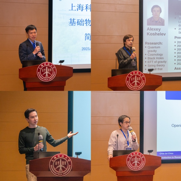 中心主任杨毅教授介绍了基础物理中心的成立背景、研究领域与发展目标,并宣读了国际咨询委员会委员暨特聘访问教授——英国皇家院士、牛津大学Fernando Alday教授与德国马克斯·普朗克引力物理研究所所长Hermann Nicolai教授发来的贺电。中心核心团队成员阿里克谢(Alexey S. Koshelev)、亚历山大(Alexander Ochirov)和周家瑞三位教授也分别围绕各自研究领域作了简要介绍。