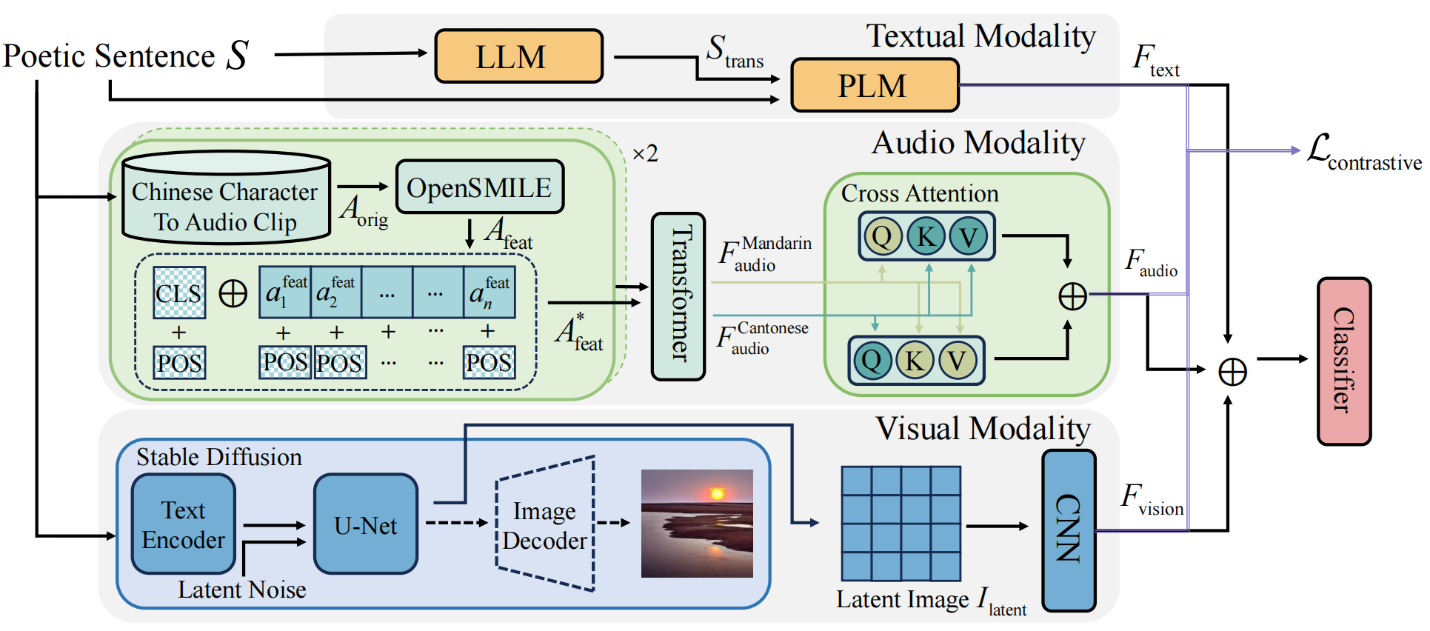 中华古典诗歌的情感表达不仅依赖文字内涵,更通过韵律节奏与画面意象共同传递(图3)。现有研究多聚焦于文本分析,忽略了诗歌特有的音韵特征与视觉元素,导致情感理解不够全面。为此,课题组设计了一种融合语音、视觉与文本的三模态中文表征框架(图4),首次将方言音频特征与生成式视觉特征引入古典诗歌的情感分析中。该框架在公开数据集上达到最优性能。研究还发现,方言特征对地域性诗歌的情感分类具有显著提升作用。