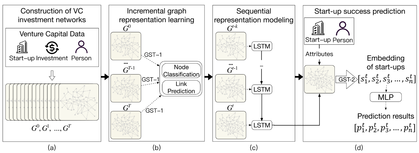 识别具有高潜力的初创企业对风险投资(VC)机构和政策制定者至关重要,但大多数初创企业最终都会失败,早期阶段企业的存活率更低。课题组基于全球40年的风险投资数据,将VC生态系统建模为连接初创企业与个人(投资者/管理团队)的动态二部图网络(图1),提出了一种预测初创企业在首轮融资后5年内能否成功的方法(图2)。实验表明,该模型能够识别出成功概率是专业投资者所选企业两倍的早期初创企业。模型识别出人脉资源、教育背景等关键成功因素,与风险投资文献的研究结论一致。