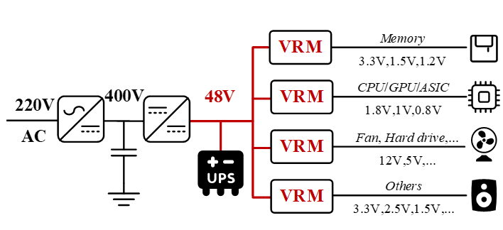 随着人工智能、云计算等技术的迅猛发展,数据中心的能耗问题日益突出,尤其是以GPU、AI加速器为代表的“大芯片”负载,其供电电流需求呈指数级增长。在这一背景下,传统12V供电架构面临严重的母线损耗与配电效率瓶颈,48V供电架构因其在降低传输损耗、提升系统能效方面的显著优势,正逐步成为下一代数据中心电源系统的重要发展方向。