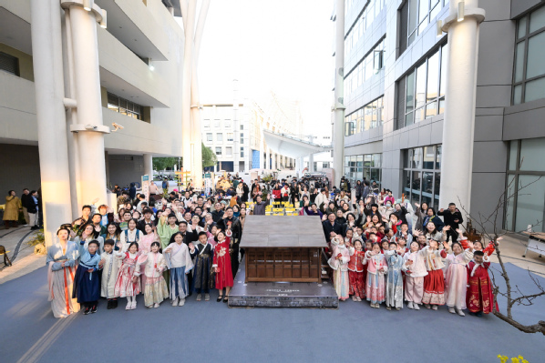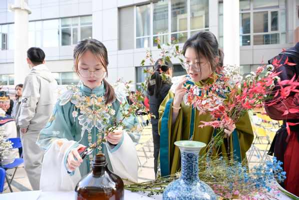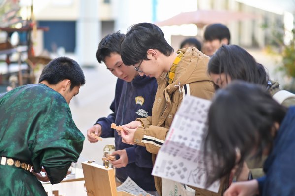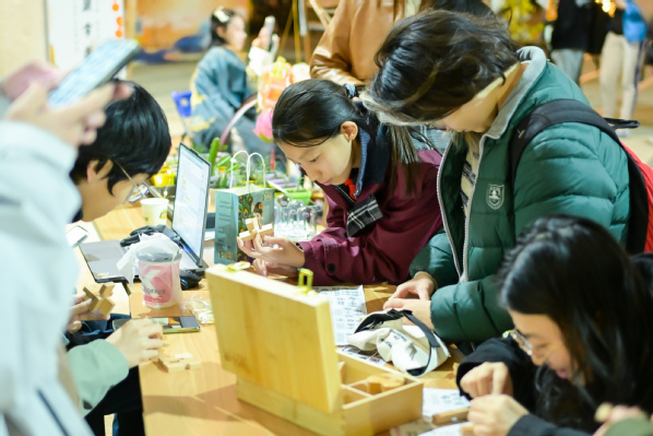 随后开启的古风集市延续了热烈氛围。“智慧之趣”体验区包含文字猜谜、鲁班锁解密;“匠心之手”体验区提供非遗漆扇制作、上科大主题拓印与插花等体验;“古风之韵”体验区安排了古风妆造与微缩景观制作;“市井之乐”体验区则重现了传统货郎市集场景。