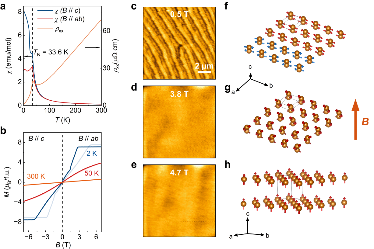 图1. EuAl2Si2单晶的磁学性质。(a)-(b)磁化率及等温磁化曲线;(c)-(e) 6 K、外磁场垂直 ab 面时0 T、3.8 T、4.7 T 下磁力显微镜图像;(f)-(h) 分别为(c)-(e)对应的自旋结构示意图。