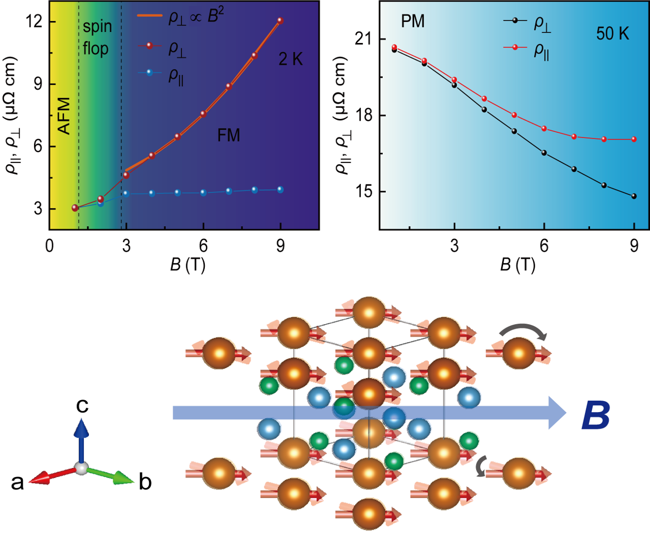 图2. 示意图揭示了其显著平面霍尔效应的起源。在顺磁态,平面霍尔效应源于被抑制的自旋涨落;而在铁磁相,经典轨道效应占据主导。