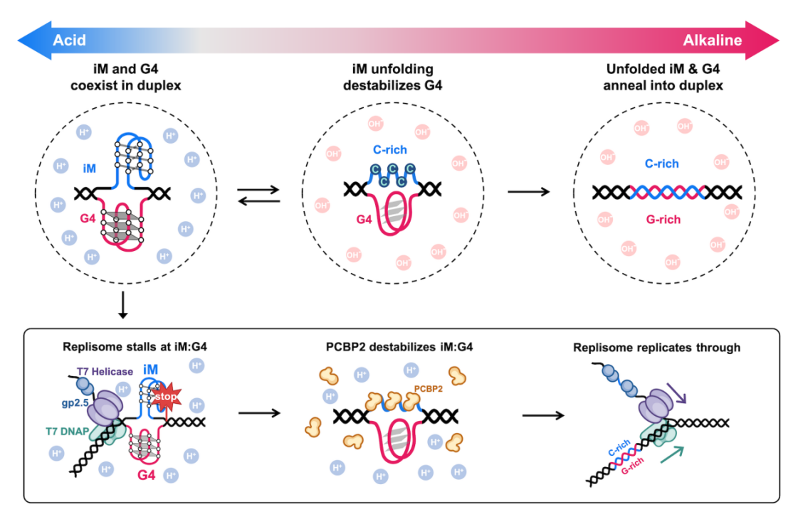 图1. iM:G4结构的动态变化及PCBP2介导的复制耐受机制。上图:微酸/中性pH下形成稳定iM:G4结构;碱性pH下iM:G4结构解折叠、退火恢复双链。下图:PCBP2通过特异性结合iM破坏iM:G4结构稳定性,消除其对T7复制体的阻滞作用。