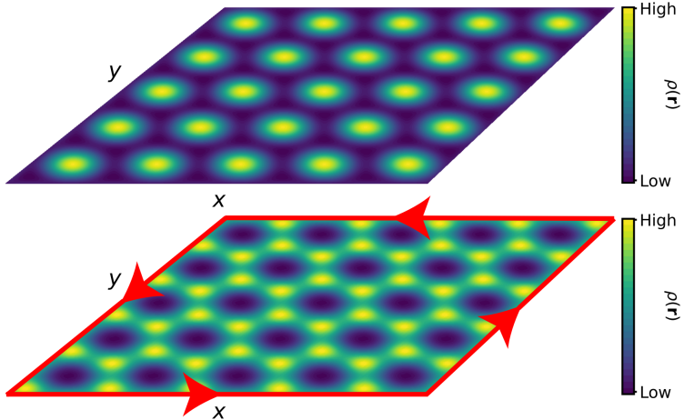 图2:反常霍尔晶体(下)形成蜂窝状晶格,红色箭头标记了拓扑边缘态电流;平庸维格纳晶体(上)为三角晶格。