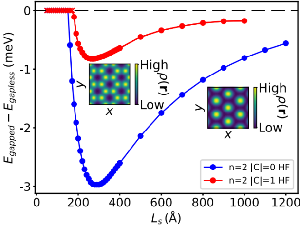 图3:基于HF平均场(左图)和“GW+RPA”(右图)分别计算的双层石墨烯狄拉克费米子模型中维格纳晶体凝聚能随电子晶格的晶格常数的变化,维格纳晶体凝聚能定义为有能隙的电子晶体总能与无能隙的费米液体总能的差,红线表示反常霍尔晶体(蜂窝晶格,|C| = 1),蓝线表示三角晶格平庸维格纳晶体(三角晶格,|C| = 0)。