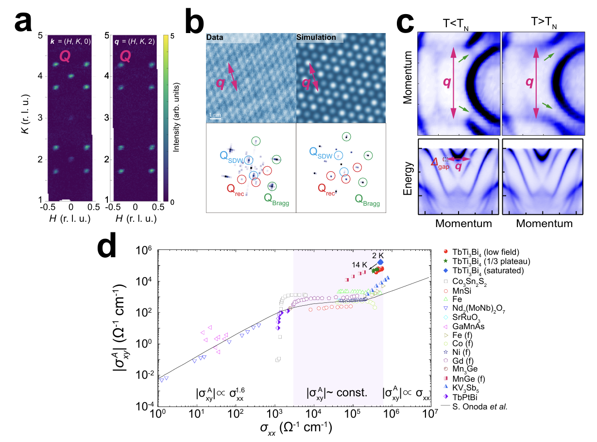 图2. TbTi3Bi4中复杂磁结构和磁电强耦合行为测量。a. 中子衍射结果证实其具有波矢为Q=(0.36, 0.29,0)的椭圆螺旋磁序。b. 自旋分辨扫描隧道显微镜结果证实其具有波矢为q=(1/3, 0, 0)的自旋密度波。c. 角分辨光电子能谱结果证实其在磁有序温度(TN)之下具有波矢为q=(1/3, 0, 0)的能带重构及大杂化能隙。d. 磁输运结果证实其相较于其他金属及kagome材料,具有巨大反常霍尔电导。