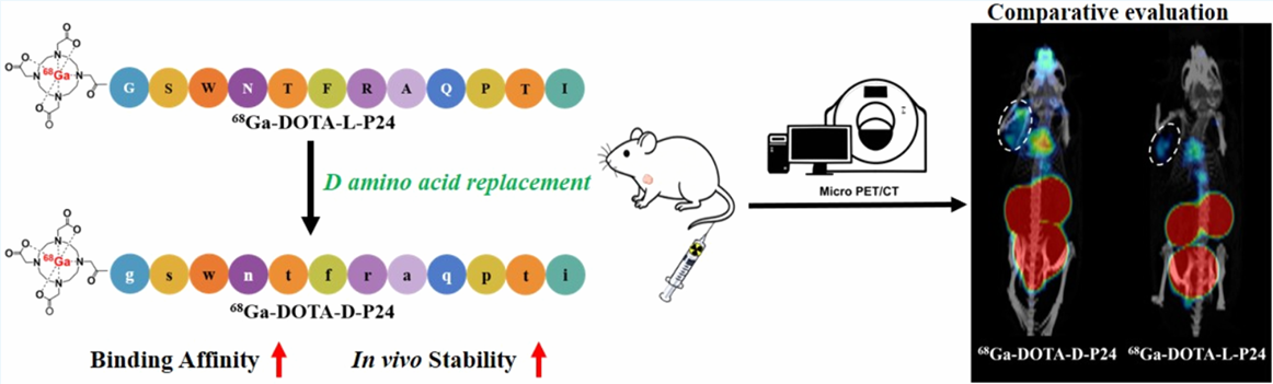 研究团队针对肿瘤免疫微环境中的关键靶点TIM-3,成功开发了新型D型多肽PET示踪剂68Ga-DOTA-D-P24。通过引入D型氨基酸修饰策略,显著增强了探针在体内的生物稳定性,有效克服了天然L型多肽易被酶降解的局限性。优化后的示踪剂在保持对TIM-3靶点良好结合活性的基础上,进一步提升了成像的可靠性与灵敏度。该示踪剂能够实现不同肿瘤中TIM-3表达的定量显像,并可动态反映免疫治疗过程中靶点水平的实时变化,为监测TIM-3在肿瘤中的表达动态及评估免疫治疗效果提供了一种新型分子影像工具。