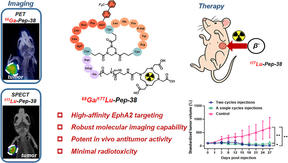 针对在侵袭性癌症中高表达的关键受体EphA2,研究人员开发了一套诊疗一体化的双环肽系统。通过对双环肽骨架进行系统性结构优化,获得了对EphA2具有纳摩尔级亲和力的新型配体Pep-34,并以此为基础构建了三种不同结构的DOTA偶联放射性示踪剂。基于该成像探针,进一步开发了与之配对的治疗性药物177Lu-Pep-38。在临床前治疗实验中,单次与双次给药均能显著抑制肿瘤生长,抑制率分别为83.6%和98.5%,且未观察到明显系统性毒性。该工作通过同一靶向配体搭载不同放射性核素,实现了诊断成像与靶向治疗的协同,为EphA2阳性恶性肿瘤提供了一种新型诊疗一体化策略。