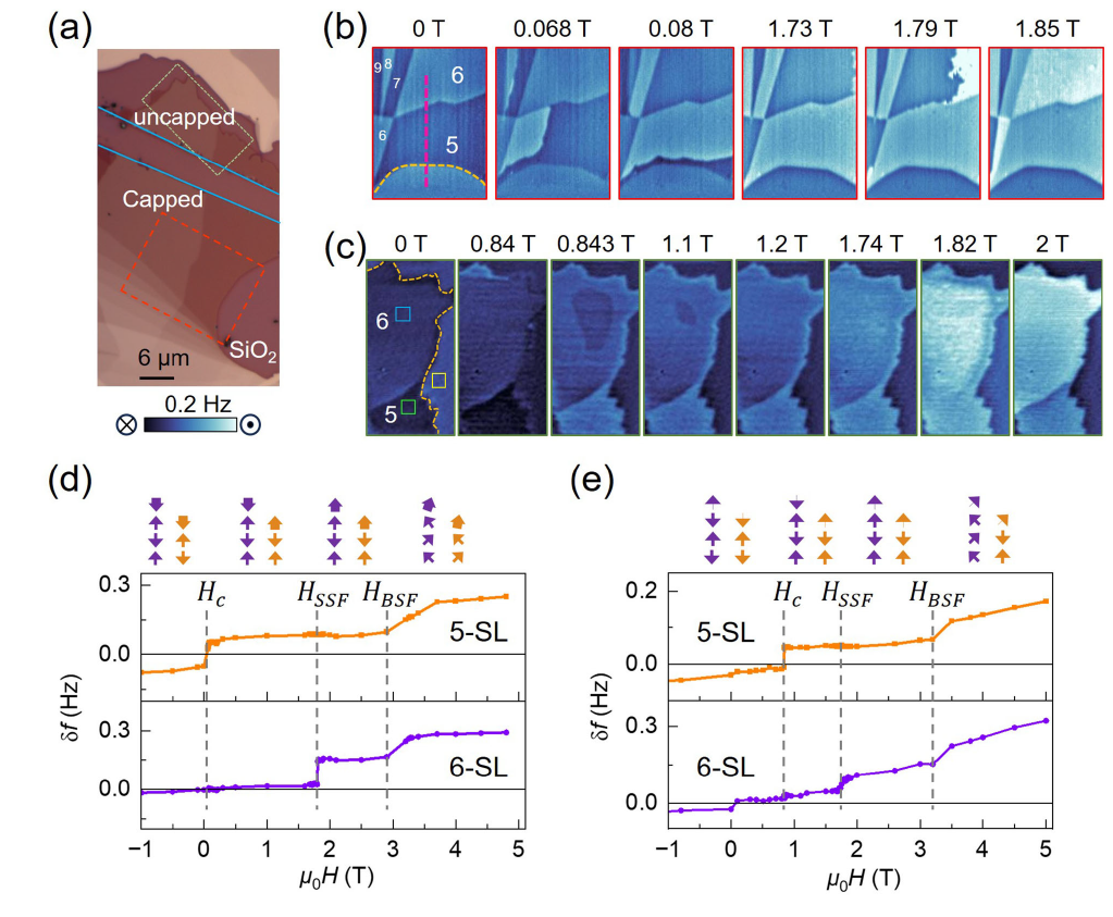 图2 (a) 覆盖氧化铝层与未覆盖的MnBi2Te4(来自同一试样)的光学图像。(b) (c) 磁力显微镜测量MnBi2Te4在变场过程中的磁翻转行为。(d) (e) 5、6层区域在不同磁场下的磁力显微镜信号。