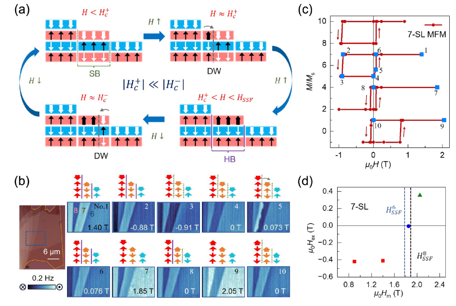 图3 (a) 2、3、4层台阶结构中形成交换偏置效应示意图。(b) 利用磁力显微镜观测6、7、8层MnBi2Te4台阶结构中交换偏置效应。(c) (d) 交换偏置场受施加最大正场调控可由负经零变为正。