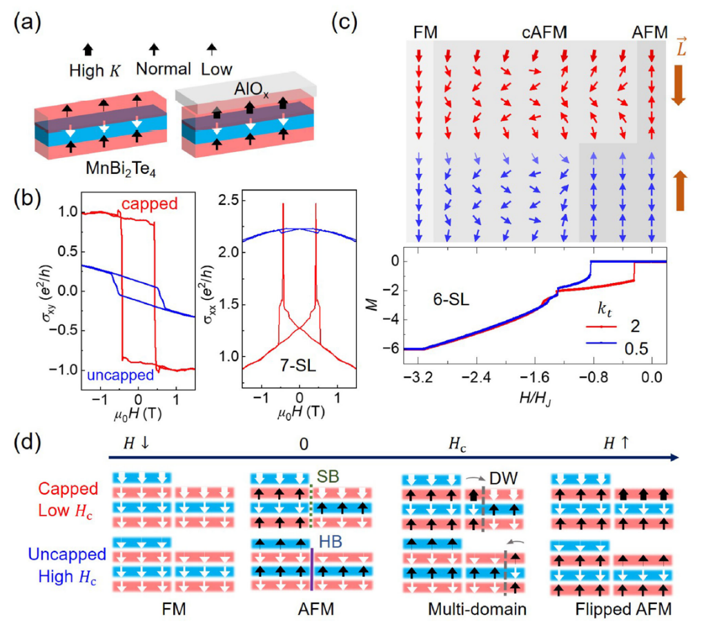 图1 (a) (b)氧化铝对于MnBi2Te4表面磁各向异性提高,从而增强量子反常霍尔效应。(c) 理论计算表明表面磁性提高与降低,会在偶数层产生相反的奈尔序。(d) MnBi2Te4中奇偶边界导致的不同畴行为。