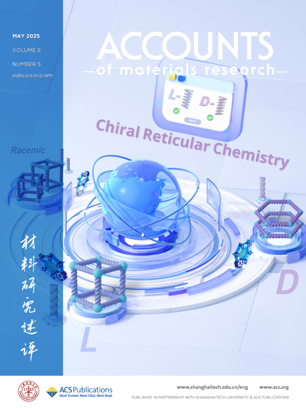图1:2025年第五期封面文章Chiral Reticular Chemistry toward Functional Materials Discovery and Beyond (Wei Gong*, Yifei Gao, Jinqiao Dong, Yan Liu*, and Yong Cui*. Acc. Mater. Res. 2025, 6, 5, 550–562.https://doi.org/10.1021/accountsmr.4c00337) 来自上海交通大学崔勇教授团队,系统总结了利用手性作为重要参数对网格框架的结构和功能进行有效调控的研究进展,展示了有机基元中手性特征的引入对于框架结构和功能拓展的重要意义。