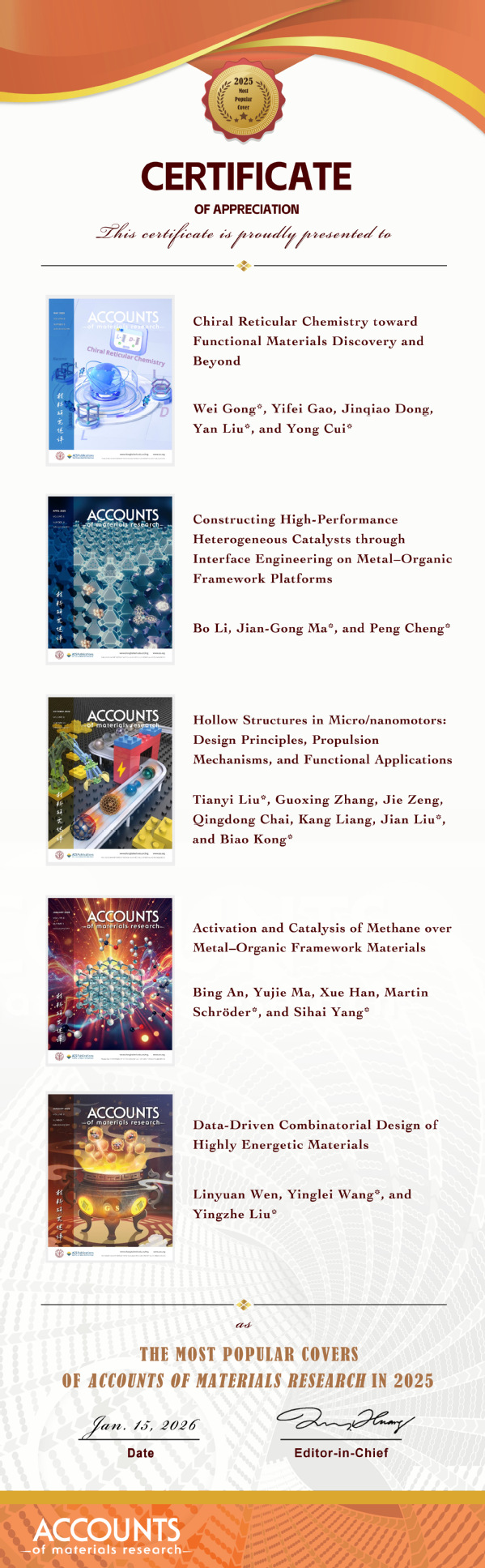 2025年1月5日至11日,Accounts of Materials Research(《材料研究述评(英文)》)举办了“2025年度AMR最受欢迎封面评选”,由读者从AMR 2025年刊发的12期的封面(共12个正封面、9个副封面)中选出最欣赏的几封。经广大读者投票,以下五个封面获评 “2025年度AMR最受欢迎封面”。