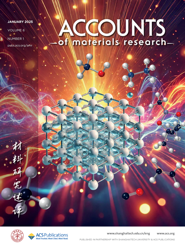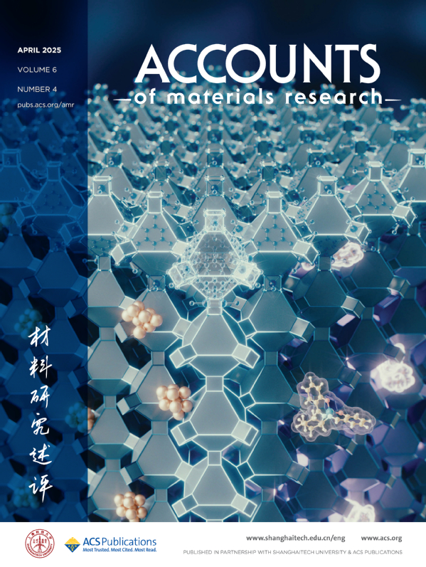 图4:2025年第一期封面文章Activation and Catalysis of Methane over Metal–Organic Framework Materials (Bing An, Yujie Ma, Xue Han, Martin Schröder*, and Sihai Yang*. Acc. Mater. Res. 2025, 6, 1, 77–88.https://doi.org/10.1021/accountsmr.4c00279)来自北京大学杨四海教授和英国曼彻斯特大学Martin Schröder教授团队。文章总结了用于吸附和转化甲烷的功能性MOF及其相关材料的设计和开发。作者利用广泛的实验和计算研究,分析了甲烷转化关键反应中活性位点及其微环境在甲烷结合和活化过程中的作用,并讨论了该领域研究的局限性和未来方向。