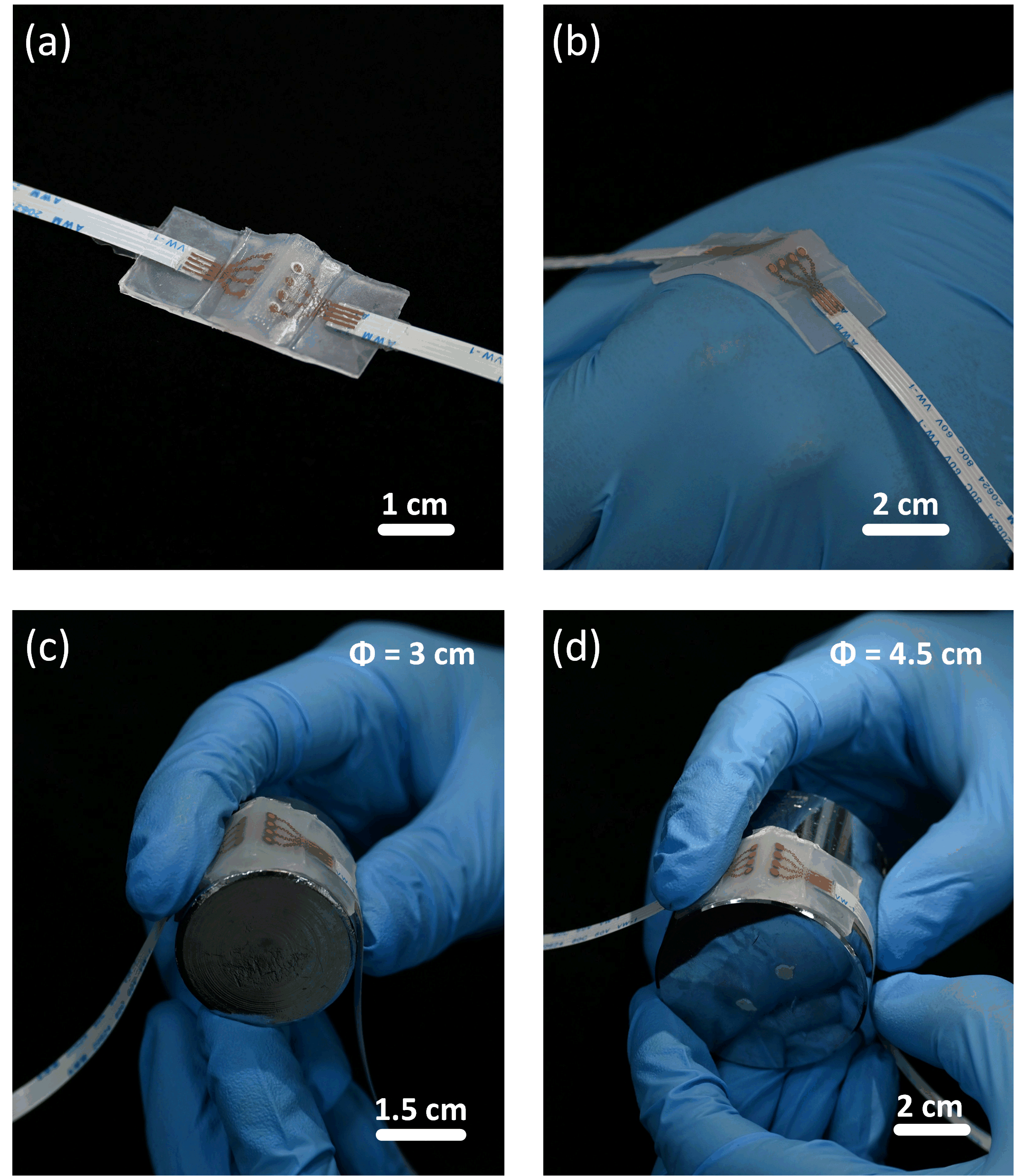 在结构上,贴片采用六阵元换能器对称排布,集成于预置30度倾角的柔性基底,贴附后形成稳定60度入射角探测皮下血管,减少佩戴过程中角度变化带来的误差,提升测量准确性与重复性。贴片具备良好柔顺性,最高可拉伸约30%,能贴合皮肤及关节弯曲区域,维持相对稳定的耦合与信号质量。