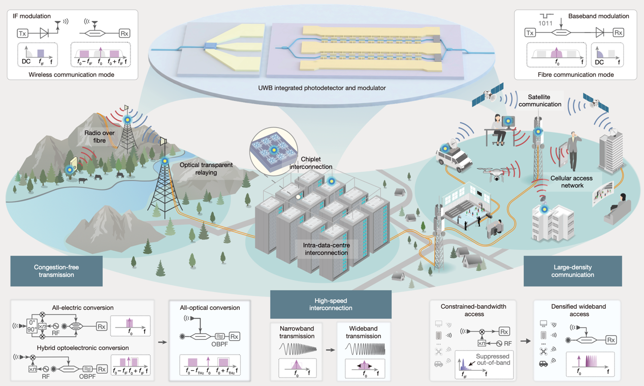 图 1:该图展示了由集成光子系统支撑的全光超宽带通信连接的概念示意,包括光纤—无线无拥塞传输、高速光纤互连以及高密度光纤—无线接入等应用场景。