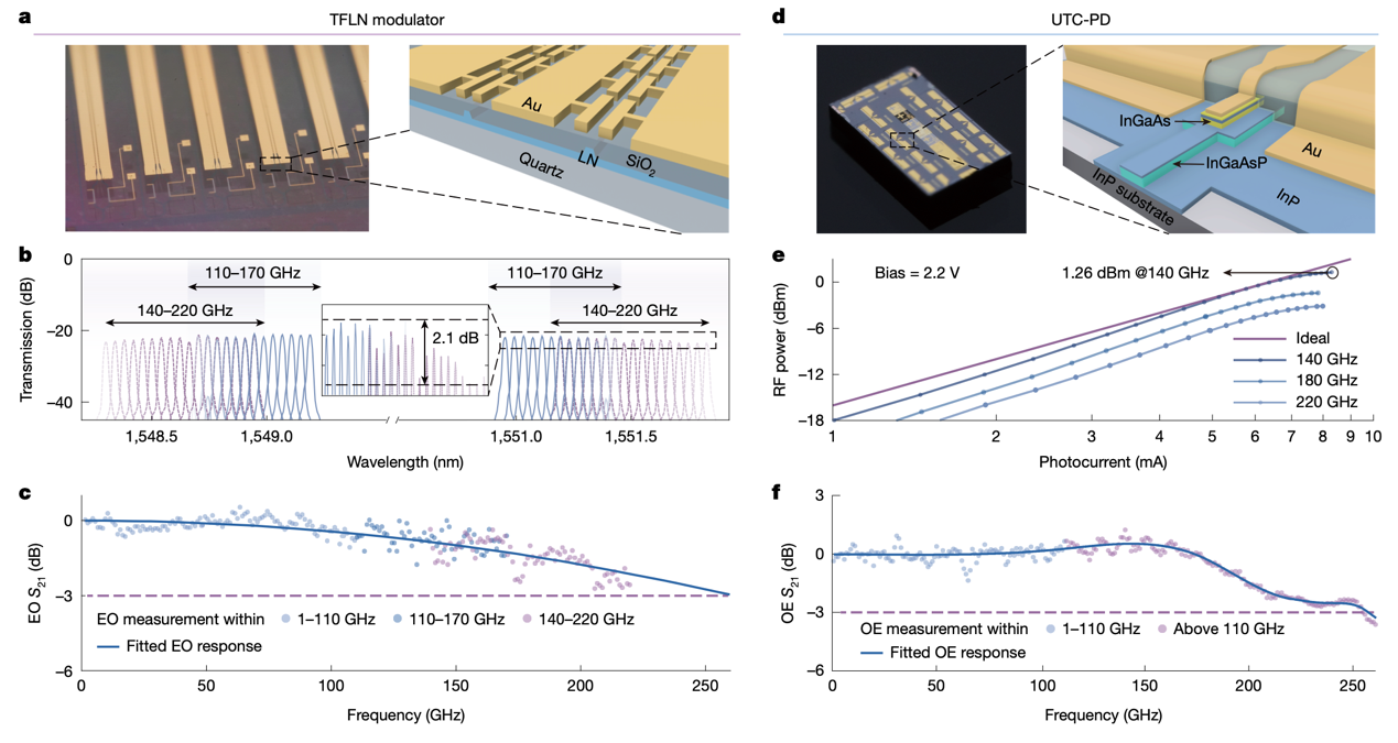 图 2:超宽带调制器/探测器及其电光/光电性能表征