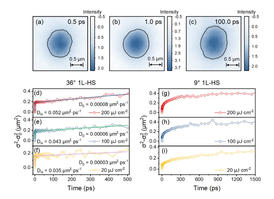 图一. 700 nm激发条件下,单层异质结构(36°)的二维瞬态吸收显微镜光谱,延迟时间分别为(a) 0.5 ps,(b) 1.0 ps,(c) 100.0 ps;弱莫尔势WSe₂/WS₂异质结(36°)体系瞬态扩散速率(σt² - σ₀²),激发功率密度分别为(d) 200 μJ·cm⁻²,(e) 100 μJ·cm⁻²,(f) 20 μJ·cm⁻²;强莫尔势WSe₂/WS₂异质结(9°)体系的瞬态扩散速率,激发功率密度分别为(g) 200 μJ·cm⁻²,(h) 100 μJ·cm⁻²,(i) 20 μJ·cm⁻²。