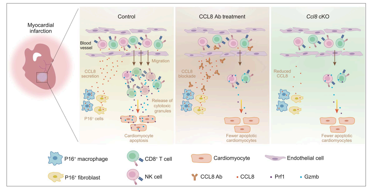 图1.研究示意图:P16阳性细胞通过分泌CCL8招募CD8+ T细胞和自然杀伤(NK)细胞,诱导心肌细胞凋亡,推动心梗后心脏不良重塑。