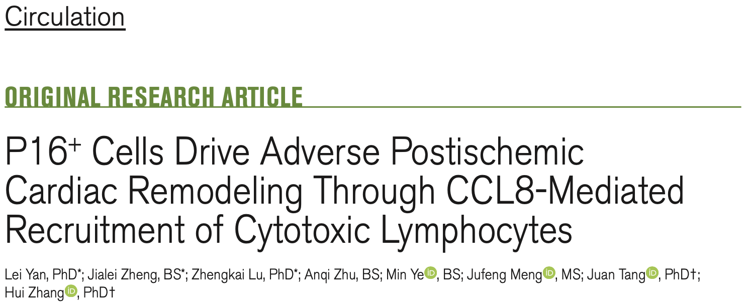 心肌梗死后,心脏会经历由炎症、细胞死亡和纤维化瘢痕形成等驱动的不良重塑,最终导致心力衰竭。然而,驱动过程中的细胞和分子机制一直未被完全阐明。近日,上海科技大学生命科学与技术学院张辉教授团队与同济大学唐娟教授团队联合在《循环》(Circulation)发表一项突破性研究,首次系统揭示了P16阳性细胞在心脏不良重塑中的关键作用,并提出了靶向CCL8信号或P16阳性成纤维细胞的精准干预新策略,为开发基于免疫调节和细胞精准治疗的新型心梗药物提供了重要的理论基础。