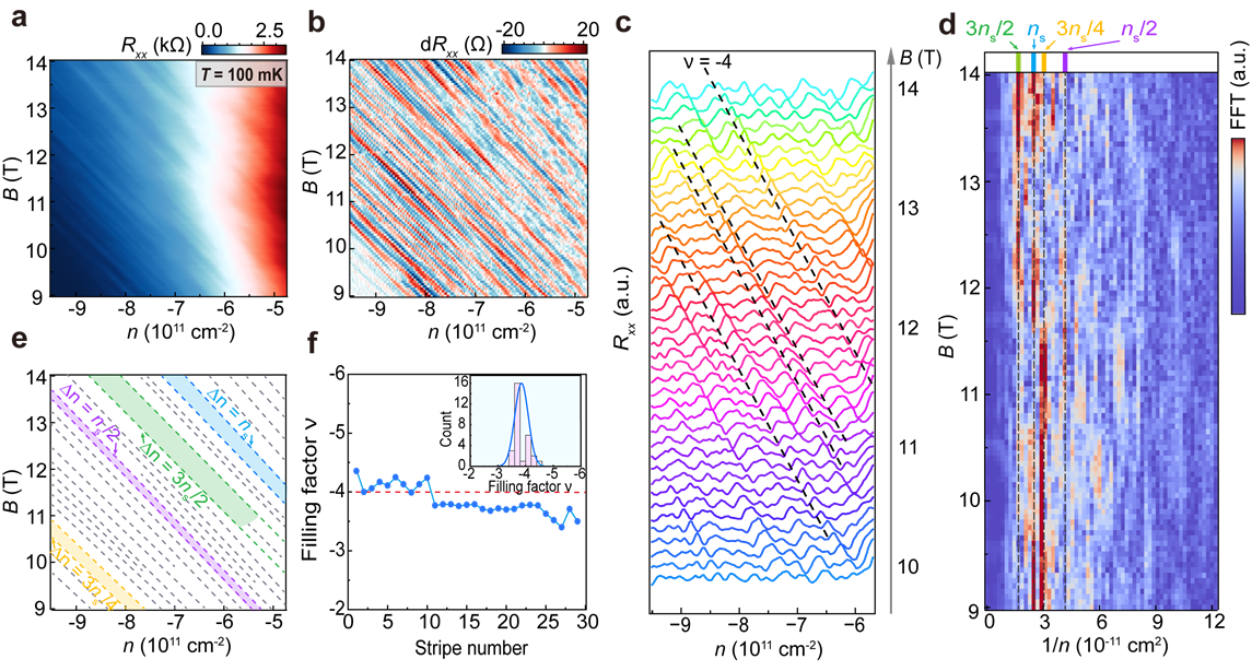 (a) n-B 参数空间中的高分辨率Rxx分布图。(b) 沿载流子浓度方向对背景扣除后的Rxx求微分后得到的分布图。(c) 不同磁场下背景扣除后的Rxx线切曲线,Rxx极小值表现出斜率一致的线性轨迹(虚线为引导线)。(d) 对 b 图进行快速傅里叶变换(FFT)得到的频谱,分辨出四种载流子浓度周期成分。(e) 与 b 图特征相对应的朗道扇形轨迹示意图。(f) 根据 e 图中线性斜率提取的朗道能级填充因子统计结果,插图为填充因子分布直方图。