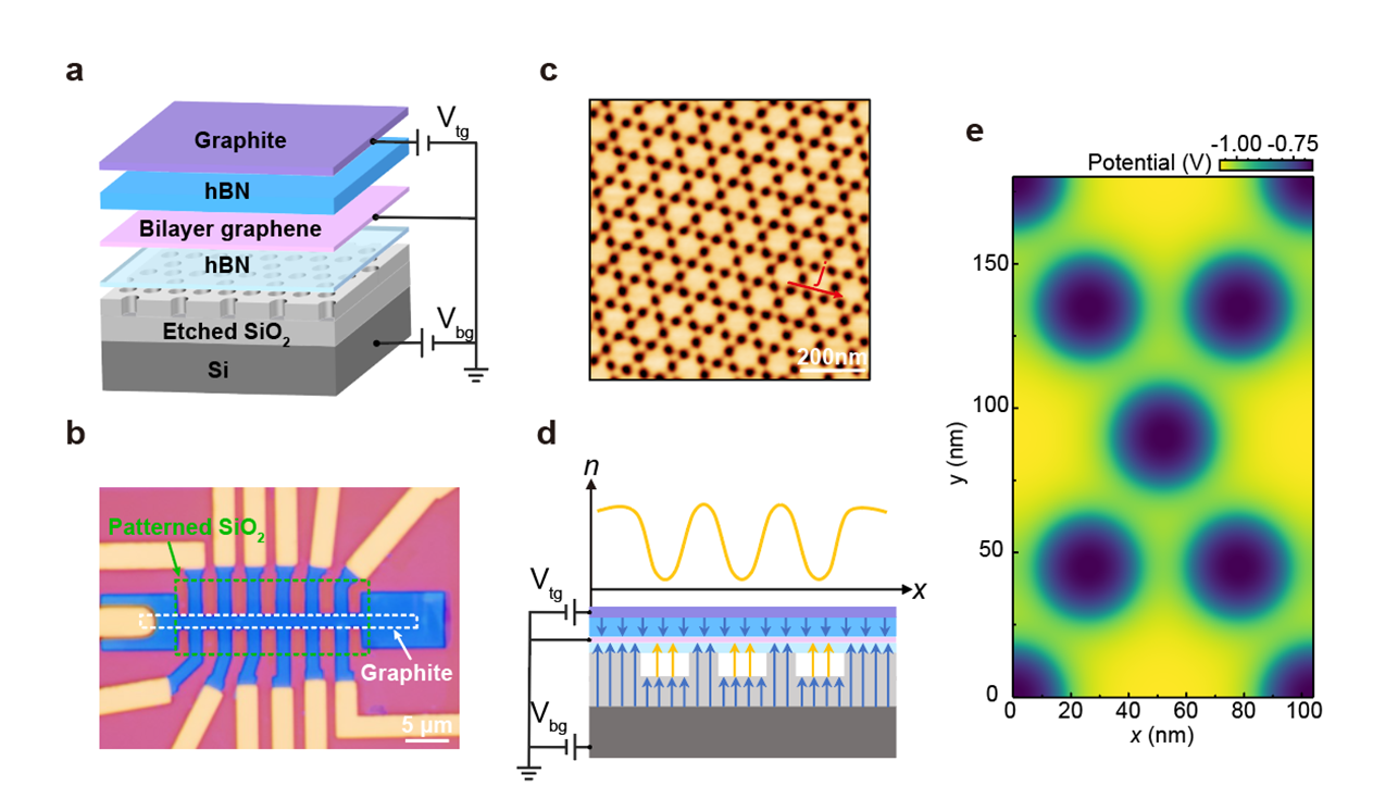 (a) 双层石墨烯Kagome超晶格器件结构示意图。通过在SiO2介电基底上进行纳米图案化,引入周期性静电势场,在双层石墨烯中形成Kagome人工超晶格。(b) 器件光学显微图像。(c) 原子力显微镜图像显示规则排列的Kagome图案结构。(d) 超晶格势场形成示意图。周期性介电结构在背栅电压作用下产生空间调制的静电势,从而实现能带工程调控。(f) 静电势分布模拟图。