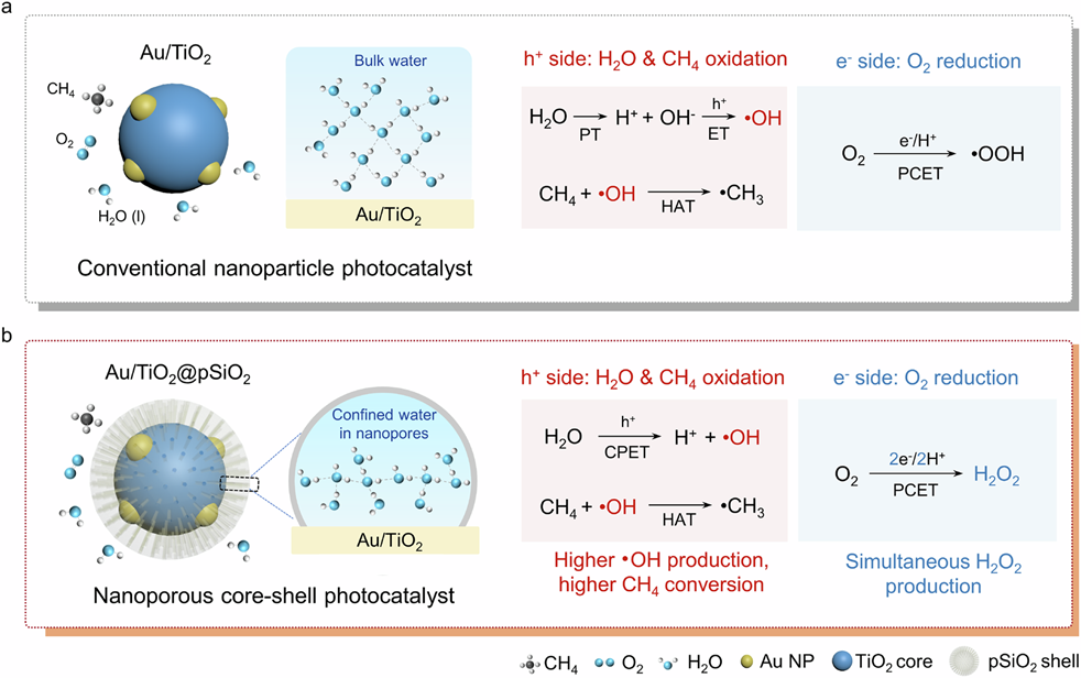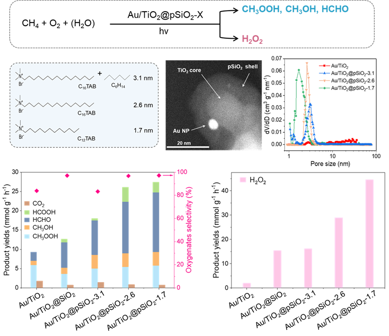 图2.核壳催化剂孔道限域促进光催化甲烷转化与双氧水同步合成