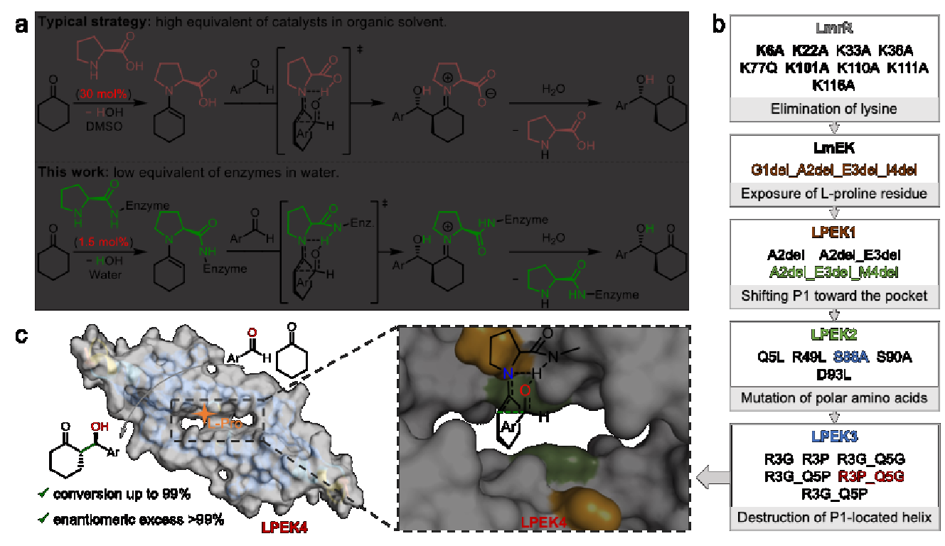 不对称醛缩反应是构建手性碳–碳键的核心方法,在药物分子和精细化学品合成中具有重要意义。传统的L-脯氨酸有机小分子催化已被广泛应用,但在水相条件下稳定性有限,且难以通过遗传手段优化。近年来,研究人员尝试将有机催化机理“移植”进蛋白内部,打造具备新功能的人工酶。然而,大多数策略依赖非天然氨基酸或化学修饰,限制了体系的可扩展性和生物兼容性。为突破上述限制,李健课题组提出了一种全新的设计理念,仅利用天然氨基酸(L-脯氨酸),通过对蛋白序列与结构的理性改造,在蛋白内部构建具有有机催化活性的中心。