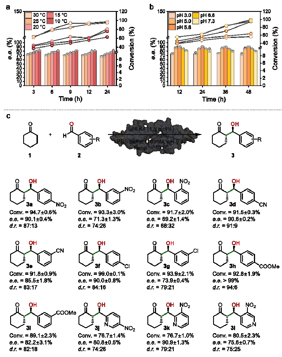 本研究选择细菌转录调控蛋白LmrR作为工程化骨架,LmrR由同源二聚体形成一个较大的疏水性内腔,为底物结合与催化提供了良好的结构基础。通过精细的结构设计,将一个天然L-脯氨酸残基重新定位为蛋白质的N端,嵌入疏水腔体内部,使其成为能够进行烯胺催化的活性中心,成功构建了基于N端L-脯氨酸的人工醛缩酶(图1)。通过对反应条件优化和底物拓展研究,该人工酶在不对称醛缩反应中可实现超过99%的底物转化率与对映选择性,并对多种芳香醛底物展现出优异的催化效率和立体控制能力(图2)。