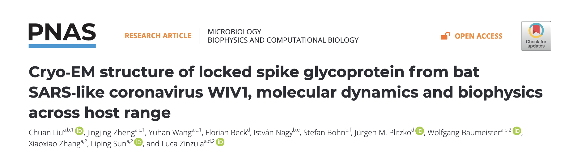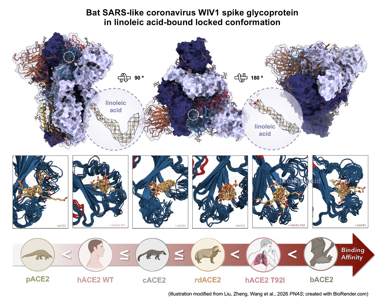 近日,上海科技大学iHuman研究所Wolfgang Baumeister课题组、Raymond Stevens课题组联合德国马克斯·普朗克生物化学研究所研究团队,在《美国国家科学院院刊》(PNAS)上发表题为“Cryo-EM structure of locked spike glycoprotein from bat SARS-like coronavirus WIV1, molecular dynamics and biophysics across host range”的研究成果,解析了蝙蝠来源SARS样冠状病毒WIV1刺突糖蛋白在“锁定”状态下的高分辨率冷冻电镜结构,系统揭示了其通过亚油酸分子调控实现跨物种受体识别的分子机制。